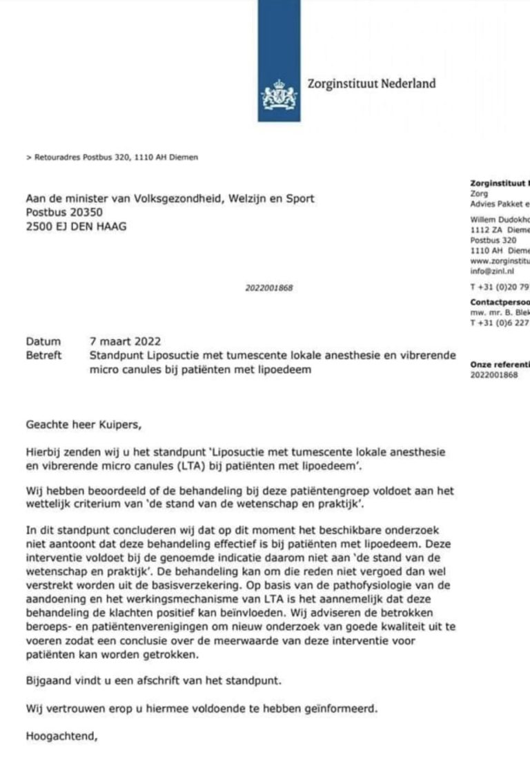 Op 7 maart 2022 is de uitspraak van het Zorginstituut gepubliceerd m.b.t. het standpunt Liposuctie met tumescente lokale anesthesie en vibrerende micro canules bij patiënten met lipoedeem.